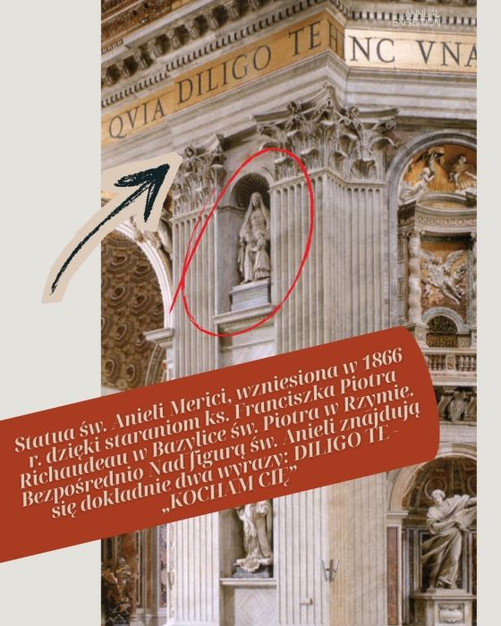 Ta pozornie drobna ciekawostka staje się dla nas ikoną powołania. Nad kamienną figurą Matki i Założycielki Towarzystwa św. Urszuli widnieją słowa, które możemy odczytać dwojako. Z jednej strony jest to wyznanie Piotra wypowiedziane wobec Jezusa - Domine, tu omnia nosti, tu scis quia DILIGO TE - „Panie, Ty wiesz wszystko, Ty wiesz że CIĘ KOCHAM” - słowa, które każdego dnia pragniemy powtarzać także my, w naszej relacji z Chrystusem. Z drugiej strony są one naszą odpowiedzią wobec św. Anieli - kochamy Cię, naszą Matkę, przewodniczkę powołania, tę, która prowadzi nas drogą wierności. A może i sama św. Aniela mówi dziś do nas: „Miłuję cię, moja siostro”. Czy słyszę jej głos?