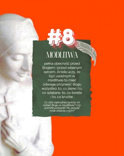 Dla św. Anieli modlitwa nie była ucieczką od życia ani sposobem na chwilowe uspokojenie myśli. Była najbardziej uważnym momentem jej dnia - chwilą, w której stawała przed Bogiem taka, jaka jest. Bez masek, bez upiększeń, bez udawania duchowej dojrzałości. Modlitwa była dla niej spotkaniem twarzą w twarz z Tym, który zna serce lepiej niż ona sama.