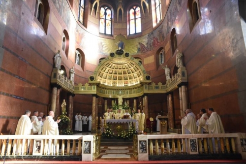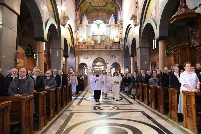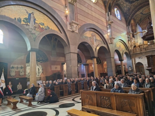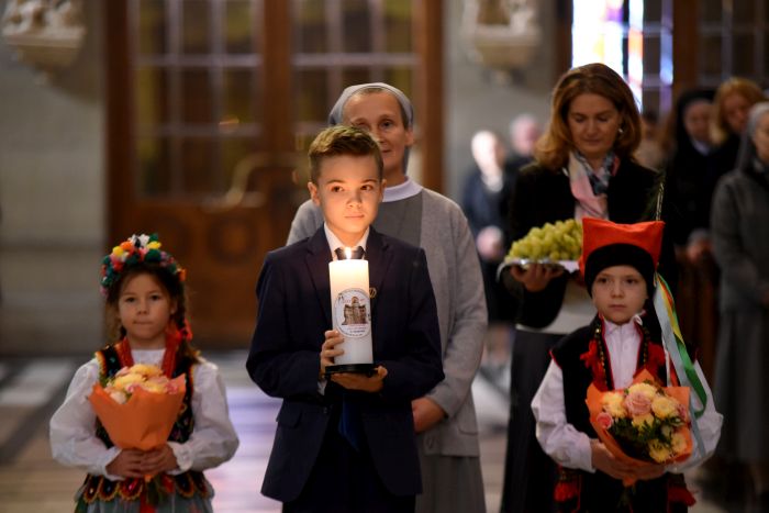 Nasze świętowanie rozpoczęliśmy uroczystą Mszą św. w Bazylice Najświętszego Serca Pana Jezusa celebrowaną przez bpa Damiana Muskusa OFM wraz z gronem kapłanów, którzy służą nam na co dzień i są z nami zaprzyjaźnieni. Nie zabrakło więc Wizytatora Księży Misjonarzy ks. Pawła Holca CM i jego współbraci, ks. infułata dra Bronisława Fidelusa oraz o. Roberta Więcka SJ, który przywitał wszystkich w imieniu o. Prowincjała Jarosława Paszyńskiego SJ. Ponadto liturgię uświetniła Schola Mariacka, wspaniała asysta, której przewodził absolwent naszej szkoły Tomasz Konturek, a także obecność pocztu sztandarowego Szkoły Podstawowej nr 159 Urszulanek UR w Krakowie. W Eucharystii uczestniczyła przełożona prowincjalna s. Iwona Skorupa, przełożona domu krakowskiego s. Maria Jaworska wraz ze wspólnotą sióstr, urszulanki z wielu domów w Polsce i na Ukrainie, a także liczne grono naszych obecnych i byłych pracowników, nauczycieli, rodziców, dzieci ze szkoły i przedszkola, studentek, absolwentek i absolwentów oraz sióstr zakonnych z wielu zgromadzeń. W jubileuszowe dziękczynienie włączyła się także krakowska wspólnota Urszulanek Serca Jezusa Konającego wraz z przełożoną s. Ewą Protaś i przełożoną Centrum Warszawskiego s. Anną Renkiewicz. Wiele osób łączyło się z nami również poprzez transmisję internetową.