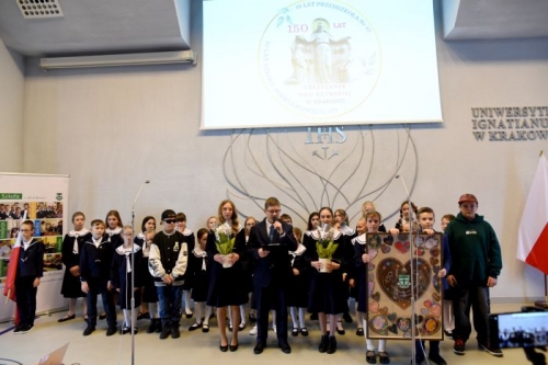 Po Eucharystii udaliśmy się do auli Ignatianum, gdzie niezwykle serdecznie przyjął nas kanclerz jezuickiej uczelni ks. dr hab. Andrzej Paweł Bieś SJ. Ta część jubileuszowego świętowania wywołała zarówno wiele radości, jak i wzruszeń. Występ przedszkolaków i uczniów naszej szkoły pod hasłem: „Ożywieni duchem św. Anieli – chodź i zobacz” nagrodzony został wielkimi brawami. Z uśmiechem oglądaliśmy więc występy maluchów, które w przepięknych, ludowych strojach brawurowo zatańczyły do utworu „Hej, na Krakowskim Rynku”, wykonały krakowiaka i zaśpiewały znaną wszystkim piosenkę „Czerwone jabłuszko”. Z łezką w oku słuchaliśmy szkolnego chóru, który pokazał szeroki wachlarz swoich możliwości, począwszy od wykonania pieśni patriotyczno-religijnej „Uwierz Polsko”, aż po pełen energii współczesny rap w piosence TGD „Miłosierni”.