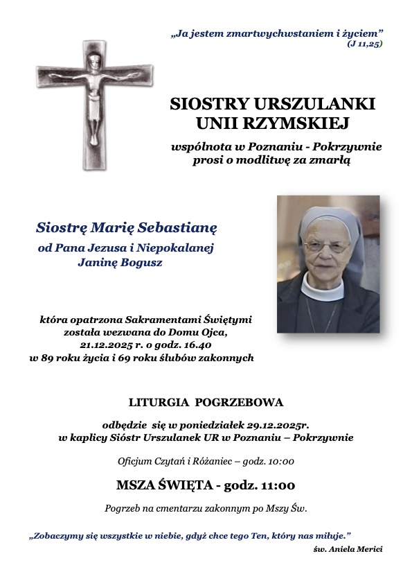 21 grudnia 2025 r. odeszła do Pana siostra Maria Sebastiana od Pana Jezusa i Niepokalanej, która przebywała we wspólnocie w Poznaniu-Pokrzywnie. Pogrzeb odbędzie się w poniedziałek 29.12.2025 r. w kaplicy Sióstr Urszulanek Unii Rzymskiej w Ponznaniu-Pokrzywnie.