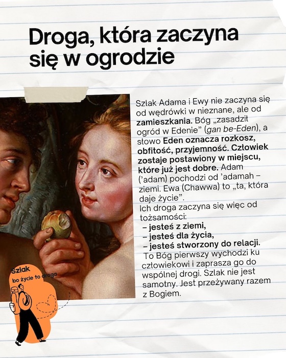 Adam, wzięty z ziemi (adamah), i Ewa, ta, która daje życie, nie musieli niczego zdobywać ani udowadniać. Otrzymali wszystko jako dar. Ich szlak zaczyna się więc od relacji, od bycia widzianym i nazwanym przez Boga, od chodzenia z Nim po ogrodzie „w porze powiewu wiatru” (Rdz 3, 8) - dosłownie ruach, tchnienia, ducha. To Bóg pierwszy wychodzi ku człowiekowi i zaprasza go do wspólnej drogi. Szlak nie jest samotny. Jest przeżywany razem z Bogiem.