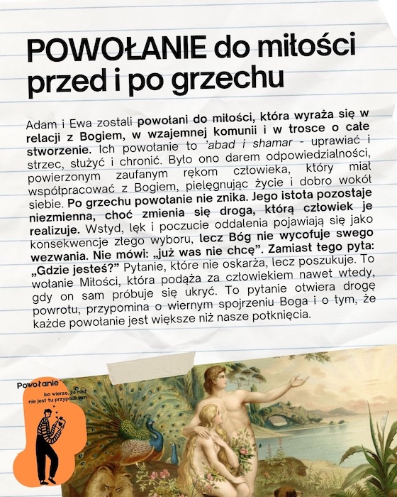 Adam i Ewa zostali powołani do miłości, która wyraża się w relacji z Bogiem, w wzajemnej komunii i w trosce o całe stworzenie. Ich powołanie to ’abad i shamar - uprawiać i strzec, służyć i chronić. Było ono darem odpowiedzialności, powierzonym zaufanym rękom człowieka, który miał współpracować z Bogiem, pielęgnując życie i dobro wokół siebie. Po grzechu powołanie nie znika. Jego istota pozostaje niezmienna, choć zmienia się droga, którą człowiek je realizuje. Wstyd, lęk i poczucie oddalenia pojawiają się jako konsekwencje złego wyboru, lecz Bóg nie wycofuje swego wezwania. Nie mówi: „już was nie chcę”. Zamiast tego pyta: „Gdzie jesteś?” - pytanie, które nie oskarża, lecz poszukuje. To wołanie Miłości, która podąża za człowiekiem nawet wtedy, gdy on sam próbuje się ukryć. To pytanie otwiera drogę powrotu, przypomina o wiernym spojrzeniu Boga i o tym, że każde powołanie jest większe niż nasze potknięcia.