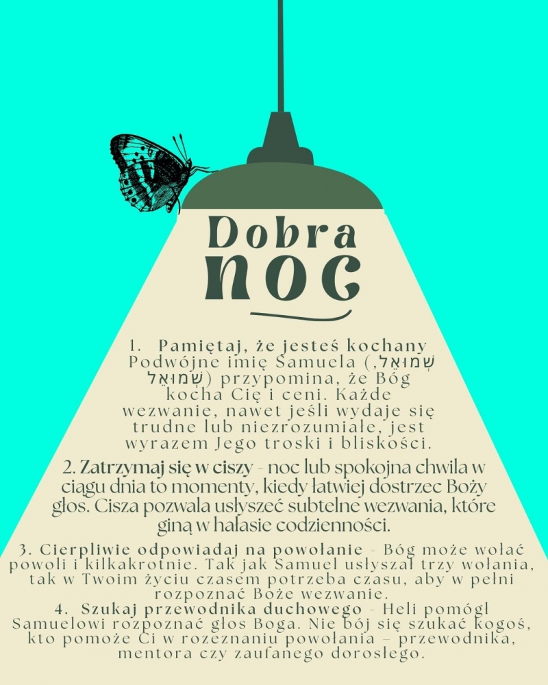 Może właśnie dzisiaj, kiedy czujesz, że coś cię niepokoi, że trudno ci zasnąć, bo w głowie krążą obrazy i myśli, których nie rozumiesz - to nie jest tylko przypadek. Może to właśnie noc twojego powołania, kiedy Bóg cicho wypowiada twoje imię. Życzę Ci, żebyś usłyszał podwójne wołanie Twojego imienia - jak Samuel. Pamiętaj, że za tym głosem stoi miłość, największy skarb, jaki możesz odkryć w swoim sercu.