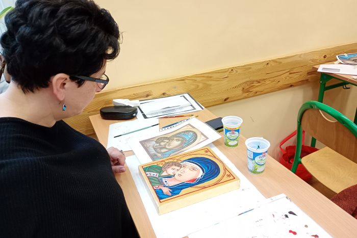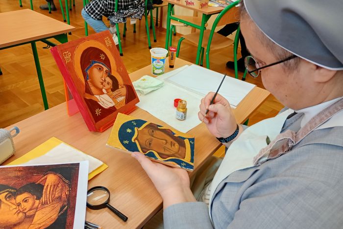 W dniach 28-30 listopada i 5-7 grudnia 2025 r., już po raz drugi, odbyły się w naszej szkole warsztaty ikonograficzne prowadzone przez s. Darię Klich. Tym razem było to spotkanie z ikoną Matki Bożej Czułej – Miłosiernej (Eleusa albo Umilienie).