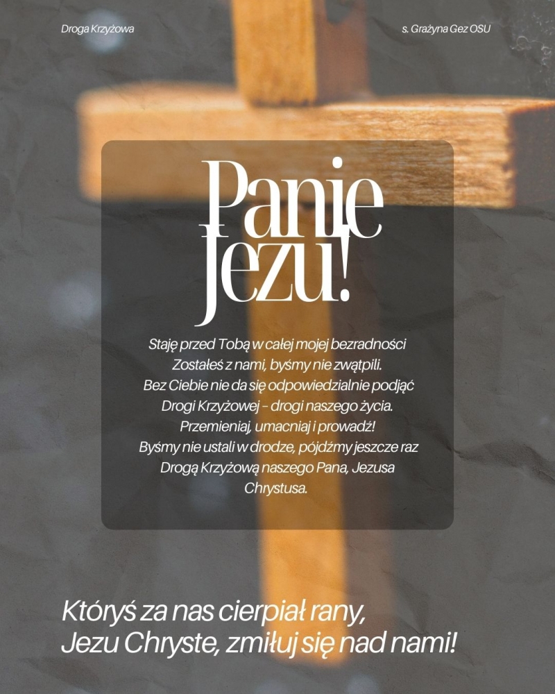 Zapraszamy do wspólnej wędrówki Drogą Krzyżową z rozważaniami autorstwa s. Grażyny Gez. To wyjątkowe słowa – pełne wiary, prostoty i głębi – zapraszają, by zatrzymać się przy Jezusie i odkrywać Jego obecność w naszych codziennych zmaganiach.