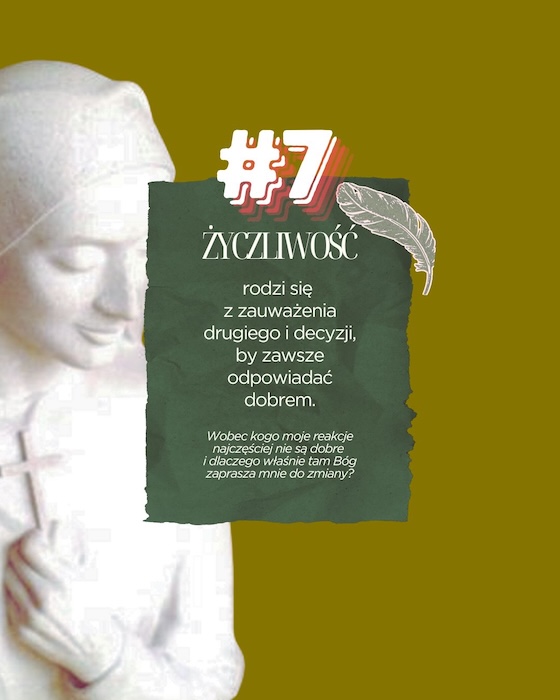 W Testamencie prosiła usilnie, by prowadzić innych ręką delikatną, a nie władczą. Sama uczyła się tej postawy, wpatrując się w Jezusa cichego i pokornego serca. Wiedziała, że prawdziwa życzliwość nie rodzi się z pobłażliwości ani z potrzeby bycia miłym za wszelką cenę, lecz z naśladowania Chrystusa, który nikogo nie przymusza, ale zaprasza. Jej uważność pozwalała jej rozpoznać granicę między troską a naciskiem, między pomocą a dominacją.