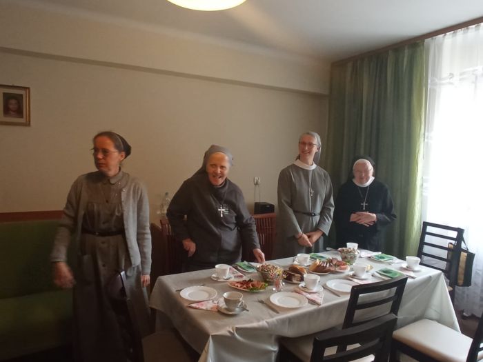 Teraz dopiero zeszłyśmy na parter na małe „co nieco” i miłą swobodną rozmowę. Było nam tak miło razem, że aż żal było się żegnać. Dobre Siostry odwiozły nas na ulicę Starowiślną.