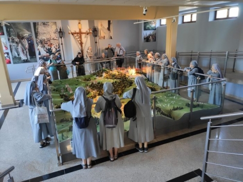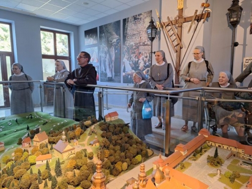Kolejnym punktem naszej kalwaryjskiej wędrówki były miejsca w sanktuarium, które wiele z nas widziało po raz pierwszy: pokój papieski, gdzie św. Jan Paweł II zatrzymywał się podczas swoich pielgrzymek do Kalwarii oraz kaplica Męki Pańskiej z zachwycającym oryginalnym tryptykiem namalowanym przez o. Franciszka Lekszyckiego OFM: Przybicie do krzyża, Ukrzyżowanie i Zdjęcie z krzyża. Następnie mogłyśmy obejrzeć makietę z dróżkami Jezusa i Maryi, podziwiając niesamowity zamysł ich fundatora Mikołaja Zebrzydowskiego, by nie tylko odtworzyć miejsca związane z męką Jezusa, ale ukazać tajemnicę zjednoczenia Matki z Synem.