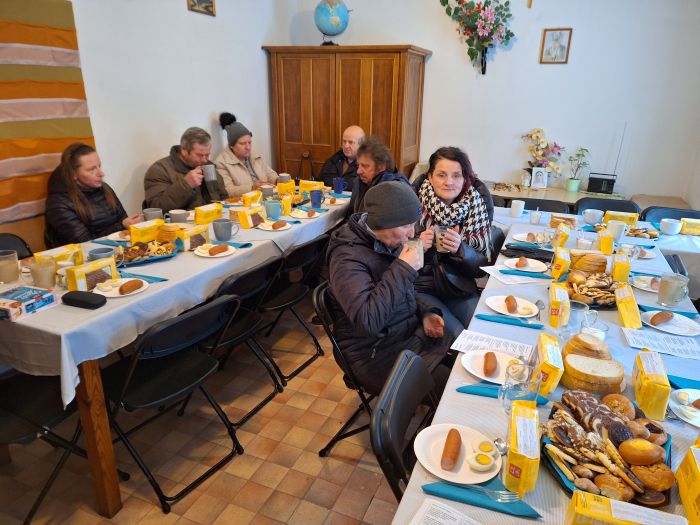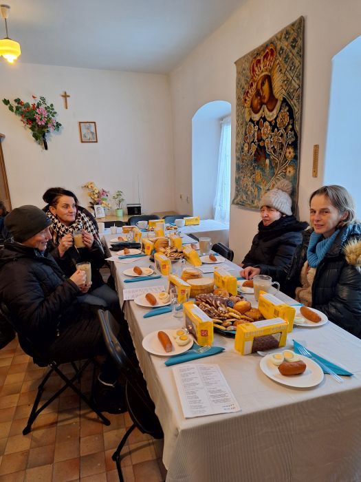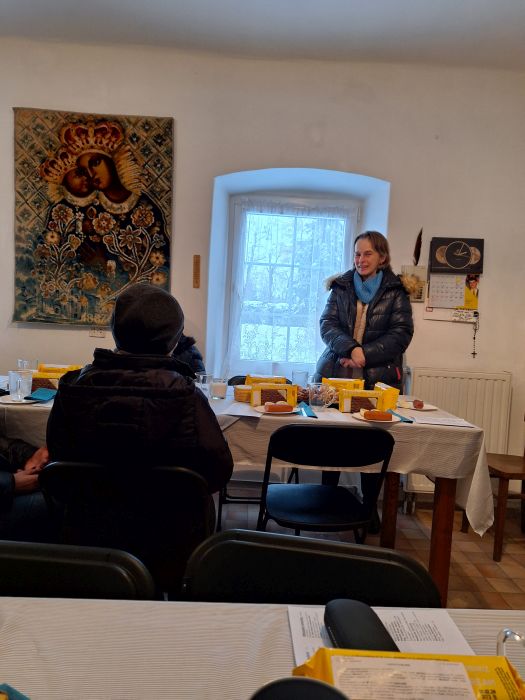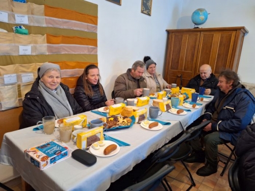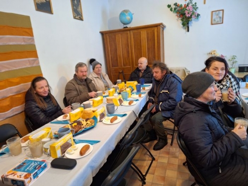 W sobotę, 13 stycznia 2024 r., odbyło się tam kolędowanie. Na ten pomysł wpadła s. Elżbieta Korbaś, która jest odpowiedzialna za wydawanie przychodzącym żywności. W organizacji pomogła jej pani Ewelina, pracownica naszego przedszkola. Uczestnicy spotkania, którzy zasiedli przy pięknie nakrytych stołach, zostali poczęstowani ciepłym żurkiem z kiełbasą i jajkiem. Były też ciastka, kawa, herbata… Jedna z pań podzieliła się swoim doświadczeniem pielgrzymki do Medjugorje i roli różańca w jej życiu. Zachęciła do modlitwy o pokój.