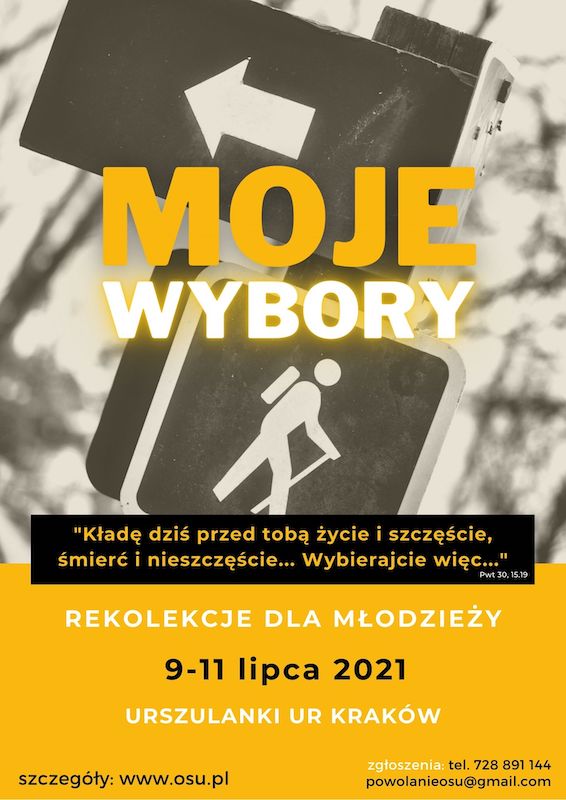W dniach 9 – 11 lipca 2021 r. zapraszamy do Sióstr Urszulanek UR do Krakowa, na weekendowe skupienie. Będziemy rozmawiać o WYBORACH I DECYZJACH! Poznawać będziemy warunki dokonania dobrego wyboru. Słowo Boże będzie naszym przewodnikiem i lampą rozświetlającą nasze codzienne ścieżki.