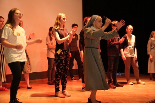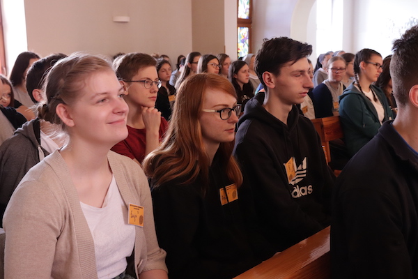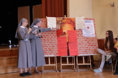 Jako, że czas jest cenny, a program bardzo bogaty, to tuż po krótkiej przerwie spotkaliśmy się po raz kolejny, tym razem na auli, gdzie miał miejsce panel dyskusyjny. Na pytania młodych odpowiadali przedstawiciele różnych dróg i form realizacji miłości: ks. Rafał TChr, s. Jana Krogul OSU, s. Agnieszka Pięta OSU- misjonarka z Senegalu oraz zaproszeni na panel goście- Rafael i Ania - świeccy misjonarze ze wspólnoty Przymierze Miłosierdzia oraz małżeństwo: Magdalena i Robert z czwórką dzieci ze wspólnoty Ichtis z Wrocławia. Pytań było wiele: o to, czy i jak szukali w swoim życiu miłości i jak Miłość ich odnalazła, gdzie w swoim życiu usłyszeć głos Boga i rozeznać Jego plan dla mnie, jak budować relację z chłopakiem/ dziewczyną w czystości, itp. W wielu kontekstach i z ust różnych osób nieraz powracały dziś słowa zaczerpnięte z Ewangelii wg św. Jana: ,,To nie wyście mnie wybrali, ale Ja was wybrałem”, przypominające nam o tym podstawowym fakcie, że inicjatywa zawsze należy do Jezusa, który od początku pragnie naszego dobra i szczęścia.