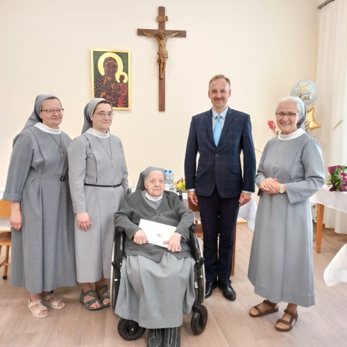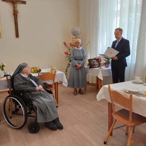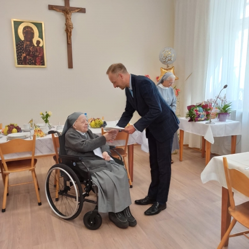 Nie zabrakło również akcentów państwowych: listy z gratulacjami oraz życzeniami z okazji 100-lecia urodzin S. Blanki Haliny Sugiero nadesłał Prezes Rady Ministrów, pan Premier Mateusz Morawiecki, oraz szef Urzędu do spraw Kombatantów i Osób Represjonowanych, pan Jan Józef Kasprzyk. Podczas uroczystego obiadu gościłyśmy natomiast zastępcę kierownika Urzędu Stanu Cywilnego, pana Krzysztofa Konarskiego, który przekazał Jubilatce życzenia od Prezydenta Miasta Poznania, pana Jacka Jaśkowiaka.