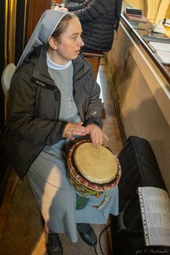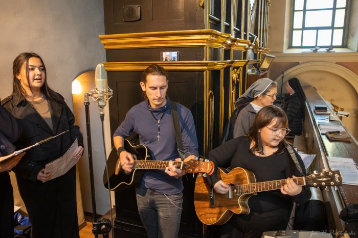 Tego dnia posługę muzyczną podczas adoracji pełnił nasz nowy zespół muzyczny „Przy studni”, który od miesiąca regularnie spotyka się na próbach w naszym tarnowskim domu. W skład zespołu wchodzą: Marcin (gitara), s. Lucyna, s. Justyna, kilka dziewczyn z pobliskiej szkoły średniej oraz dziewczęta z naszej bursy. Wspólne muzykowanie staje się dla tej grupki około 12 osób nie tylko formą służby, ale także pięknym doświadczeniem wspólnoty i modlitwy.