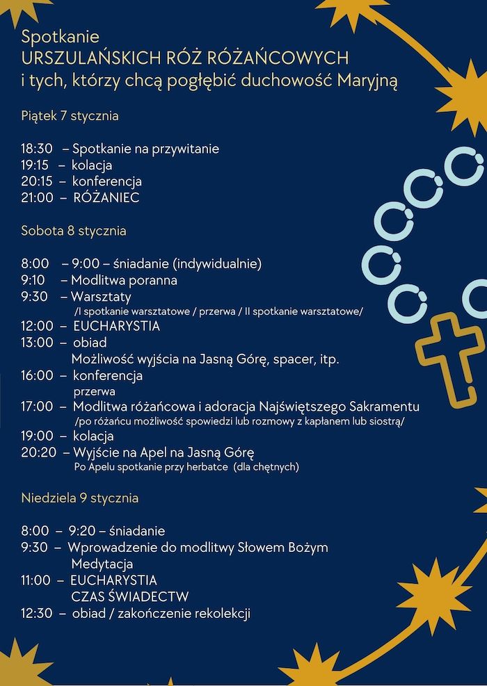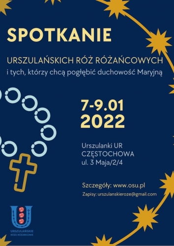 Zapraszamy URSZULAŃSKIE RÓŻE RÓŻAŃCOWE i WSZYSTKICH, KTÓRZY CHCĄ POGŁĘBIĆ SWOJĄ WIĘŹ Z MARYJĄ na spotkanie formacyjne – rekolekcje weekendowe. Spotkanie odbędzie się 7- 9 stycznia 2022 roku, u Urszulanek UR w Częstochowie.