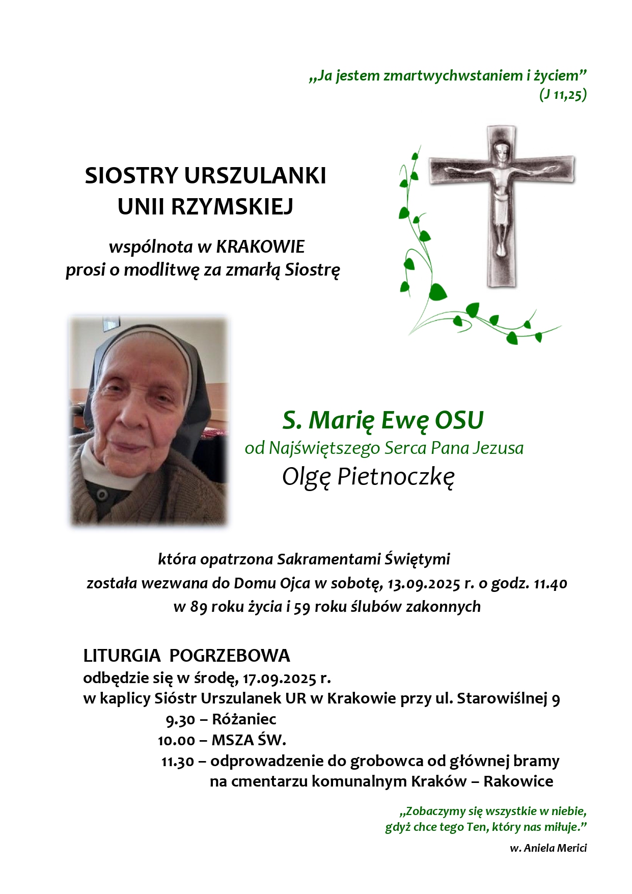 13 września 2025 r. odeszła do Pana siostra s. Maria Ewa od Najświętszego Serca Pana Jezusa, która przez ostatnie lata przebywała we wspólnocie w Krakowie. Pogrzeb odbędzie się w środę 17.09.2025 r. w kaplicy Sióstr Urszulanek Unii Rzymskiej przy ul. Starowiślnej 9, w Krakowie.