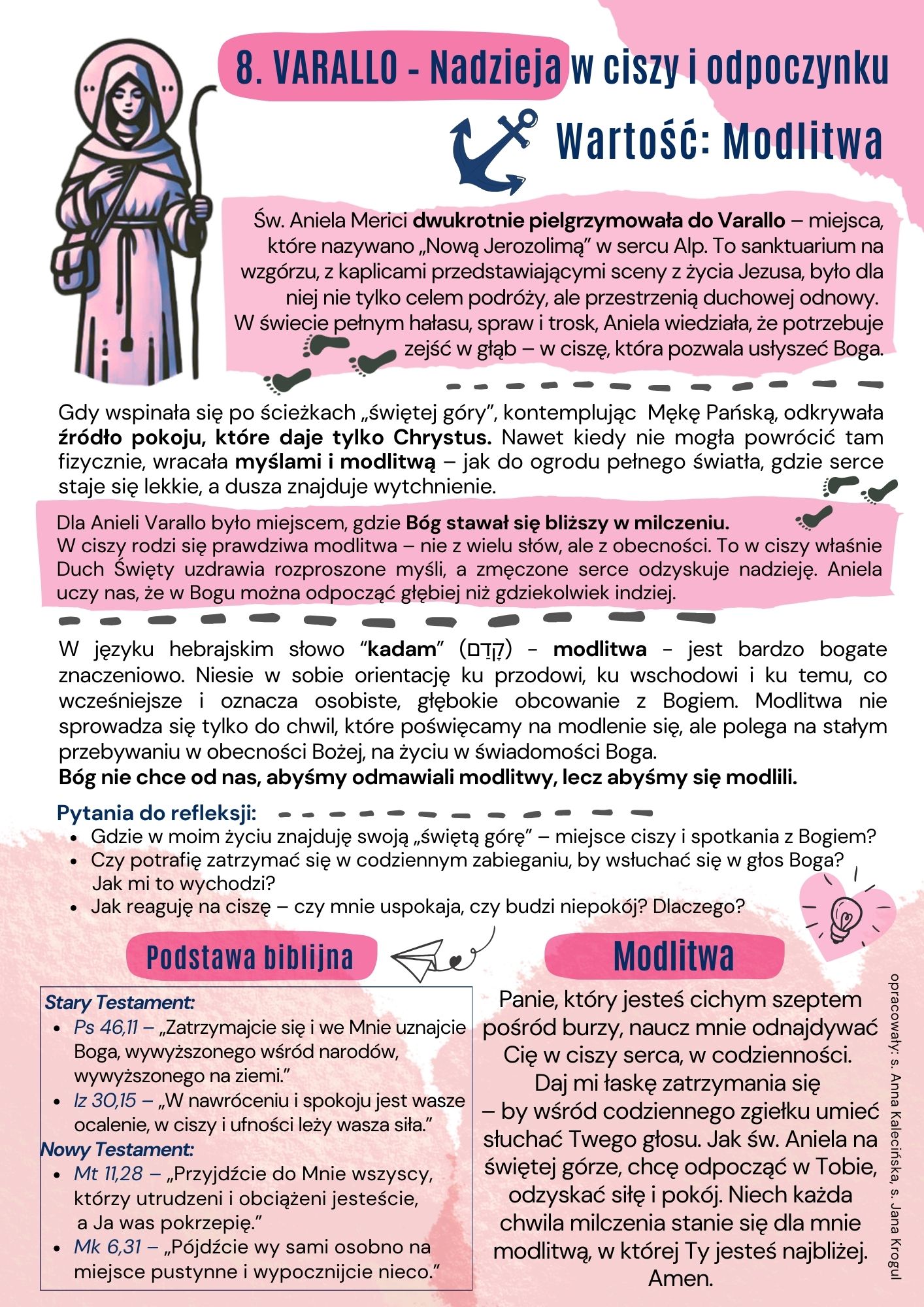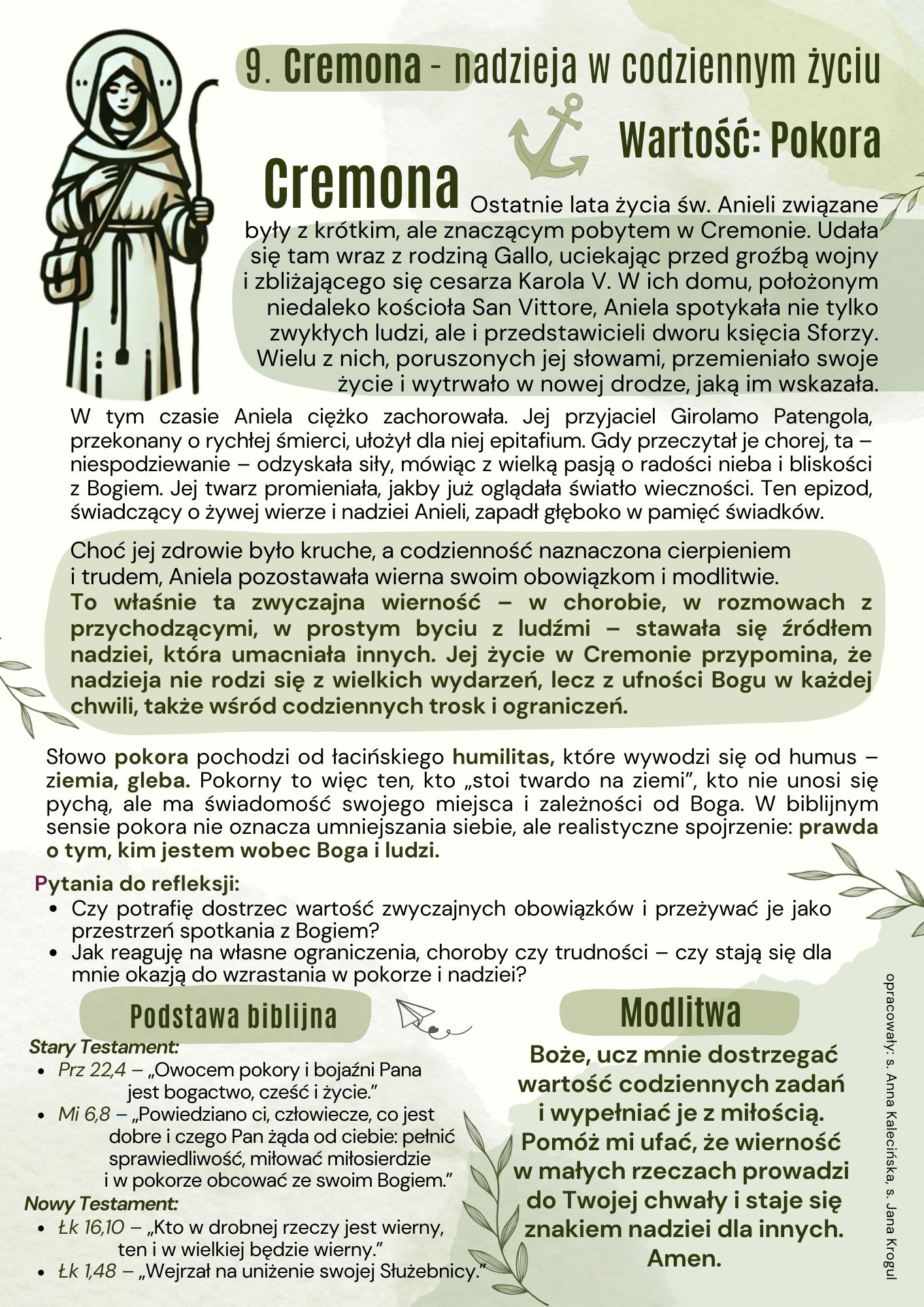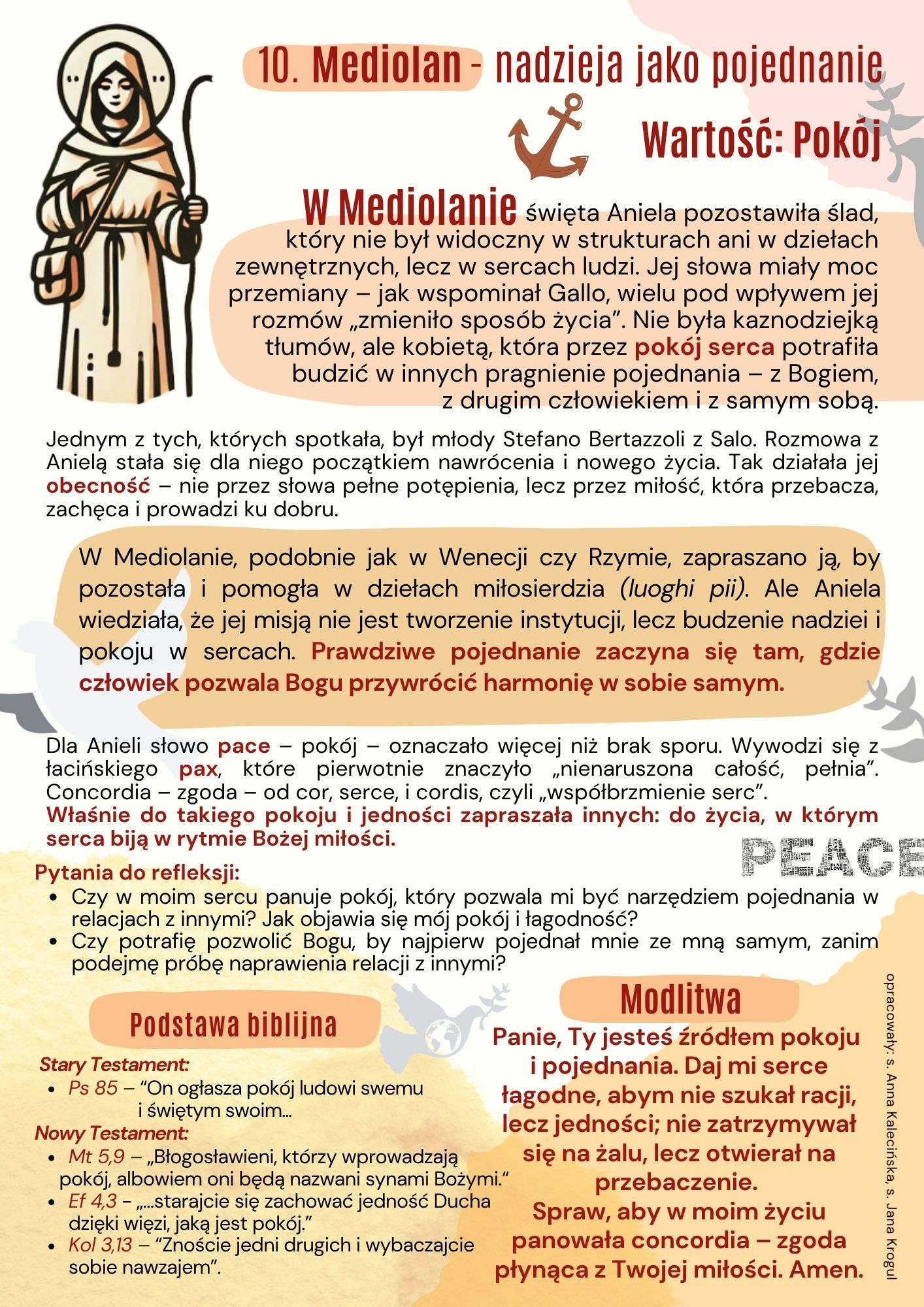 W każdym miesiącu będziemy mieli okazję do refleksji nad tym, jak za przykładem św. Anieli, możemy kształtować nasze życie i wprowadzać pokój oraz dobro w nasze codzienne działania. Niech ta duchowa podróż stanie się dla nas wszystkich źródłem siły i nadziei, prowadząc nas ku głębszemu poznaniu i doświadczeniu Bożej miłości. Kto wie, może ktoś z nas będzie miał również możliwość fizycznego pielgrzymowania do ziemi św. Anieli i odwiedzi te miejscowości, w których żyła i apostołowała? Z pewnością warto się zastanowić także nad taką wyprawą.