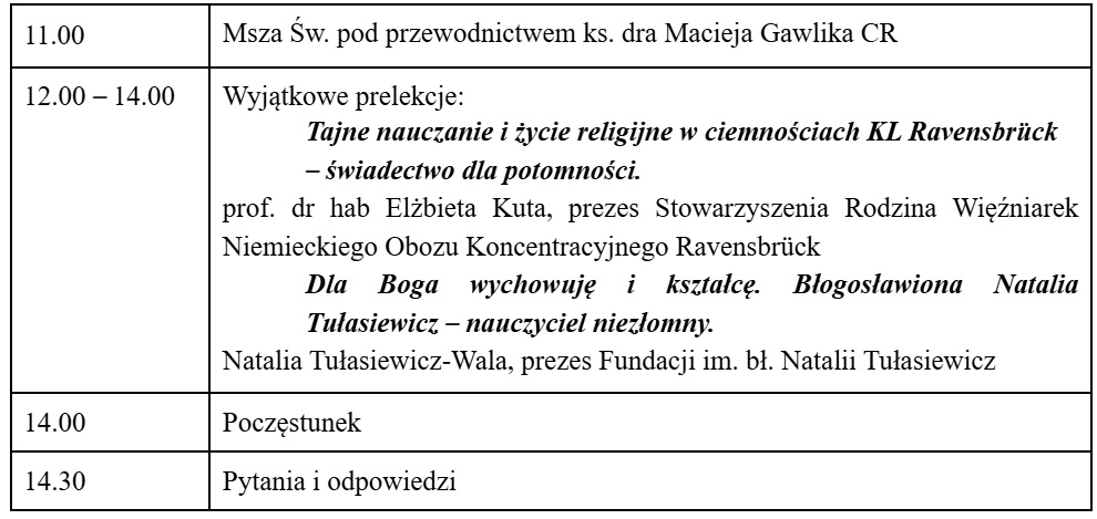 Z okazji zbliżającej się 80. rocznicy śmierci bł. Natalii Tułasiewicz, Patronki Nauczycieli w Polsce oraz 80. rocznicy wyzwolenia niemieckiego kobiecego obozu koncentracyjnego w Ravensbrück, serdecznie zapraszamy na wyjątkowe spotkanie o niezwykłych kobietach, nauczycielkach, które, pośród całego okrucieństwa wojny, troszczyły się o rozwój młodego pokolenia. Wnosiły światło, dawały nadzieję na myśl o przyszłości.