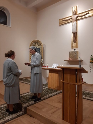 Po wspólnej modlitwie wieczornej nowa postulantka uroczyście otrzymała krzyżyk oraz pisma świętej Matki Anieli. Każda Siostra ze wspólnoty udzieliła jej błogosławieństwa, wręczając pamiątkową kartkę. Na jednej z nich można było przeczytać: Iść za Jego głosem –to zdecydować się na największą przygodę życia – nieprzewidywalną, pełną niespodzianek, ale zawsze wygraną – bo z Nim i dla Niego!