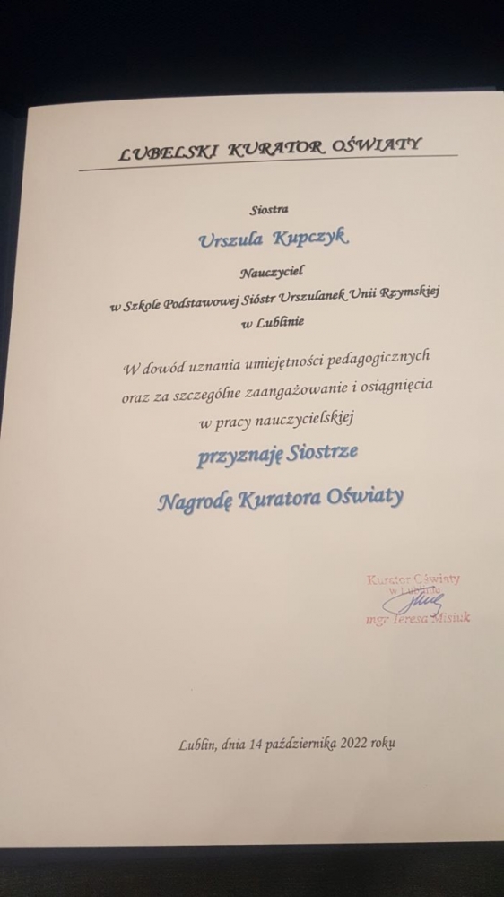 W gronie wyróżnionych Nagrodą Lubelskiego Kuratora Oświaty znalazła się nasza S. Urszula Kupczyk! Cieszymy się, GRATULUJEMY i dziękujemy Siostrze za entuzjazm i pasję, z której także i my korzystamy.
