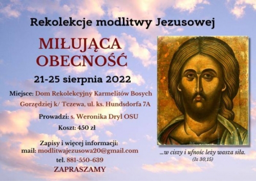 Rekolekcje MIŁUJĄCA OBECNOŚĆ to wprowadzenie teoretyczne i praktyka modlitwy Jezusowej. Są zaproszeniem dla pragnących wejść na drogę modlitwy Jezusowej i tych, którzy już podążają w głąb serca.