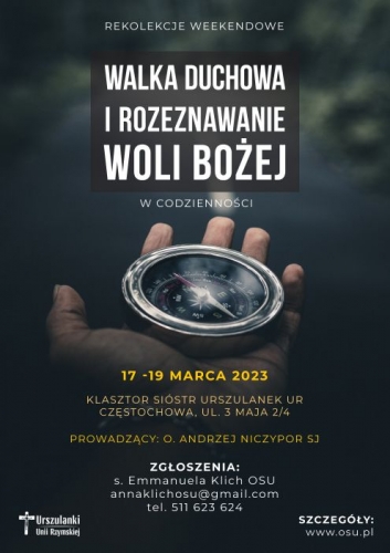 Zapraszamy na rekolekcje weekendowe "Walka duchowa i rozeznawanie woli Bożej w codzienności", które odbędą się w dniach 17-19 marca 2023 r. w klasztorze Sióstr Urszulanek UR w Częstochowie.