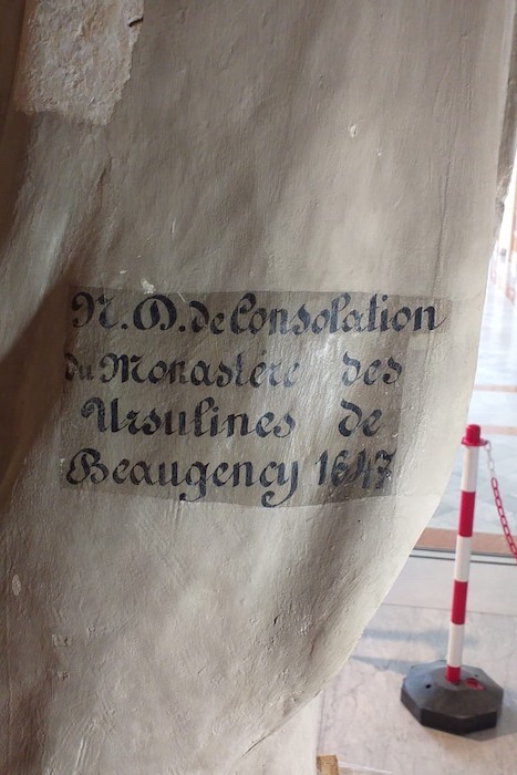 Kroniki tego klasztoru wspominają o niezwykłym wydarzeniu związanym z figurą Matki Pocieszenia. Miało ono miejsce w czasie rewolucji francuskiej, w 1792 roku. Do klasztoru w Beaugency wtargnęli jakobini z zamiarem splądrowania go, chcieli też zabrać i zniszczyć figurę Maryi. Nie mogli jednak ruszyć jej z miejsca, okazała się za ciężka. Po ich odejściu – jak podaje kronika – siostry zebrały się wokół figury, by powierzyć siebie opiece Maryi Dziewicy. Po modlitwie, przełożona poprosiła jednego z pracowników, aby zabrał posąg i ukrył go w bezpiecznym miejscu. I… uczynił to z łatwością!