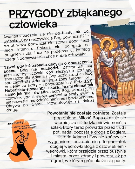Bóg, który pierwszy wychodzi w drogę. Historia powołania nie zaczyna się od Abrahama, Mojżesza ani proroków. Zaczyna się w ogrodzie - miejscu harmonii, relacji i bliskości. Zaczyna się od Boga, który stwarza, mówi, zaprasza i ufa. Adam i Ewa są pierwszymi „powołanymi awanturnikami” - nie dlatego, że szukali przygody, ale dlatego, że zostali zaproszeni do życia w wolności, która zawsze niesie ryzyko. Ich historia to szlak, powołanie i awantura - dramatyczna, ale pełna nadziei.