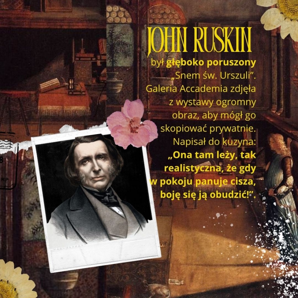 John Ruskin, (1819–1900), znany angielski polimata, esteta i krytyk sztuki zetknął się z cyklem obrazów Vittore Carpaccia o św. Urszuli podczas jednej ze swoich licznych podróży do Wenecji. Był rok 1869, gdy wpatrzony w jedno z malowideł – „Sen św. Urszuli” – zatrzymał się na dłużej w Galerii Akademii. To nie była zwykła kontemplacja dzieła sztuki. Ruskin, znany z niezwykle uważnego spojrzenia na szczegół i symbol, w Urszuli Carpaccia odnalazł duchową ikonę codziennej świętości.