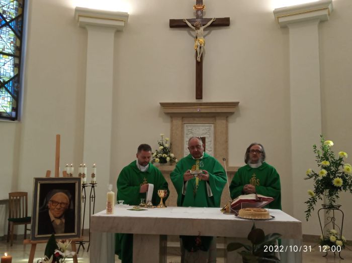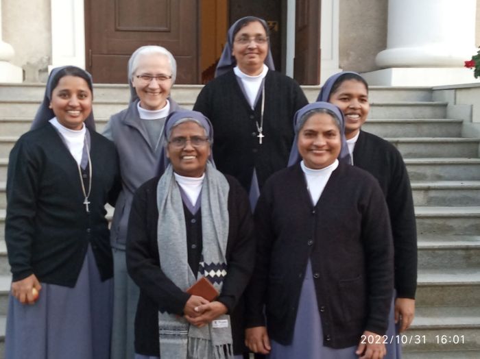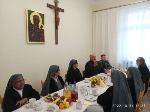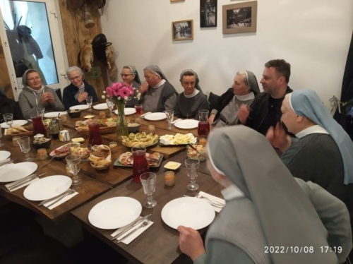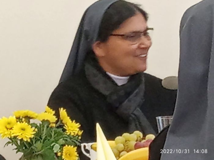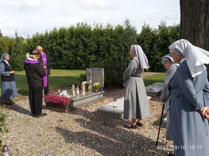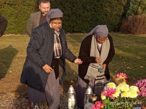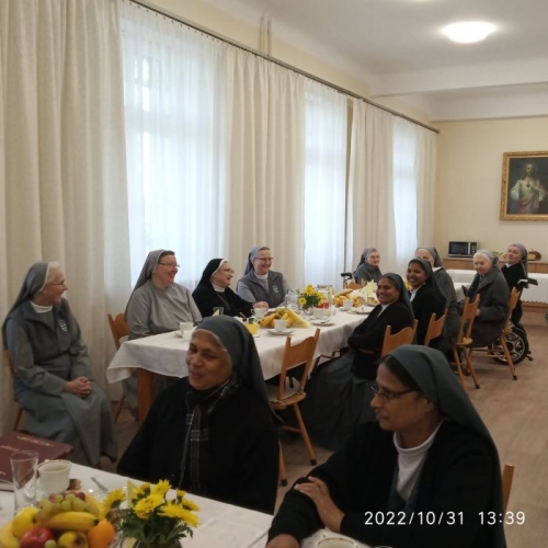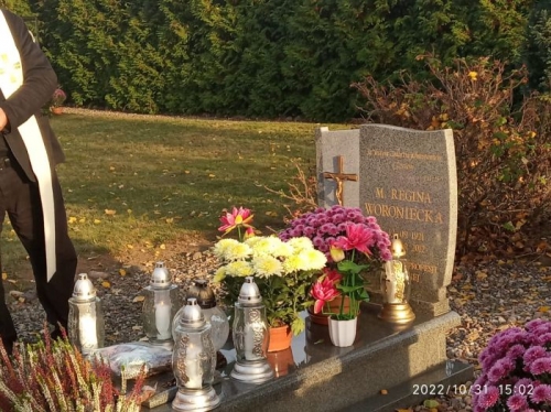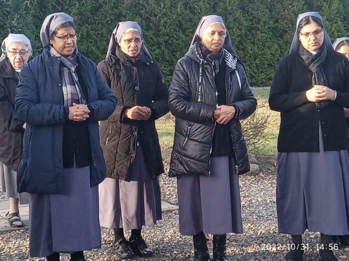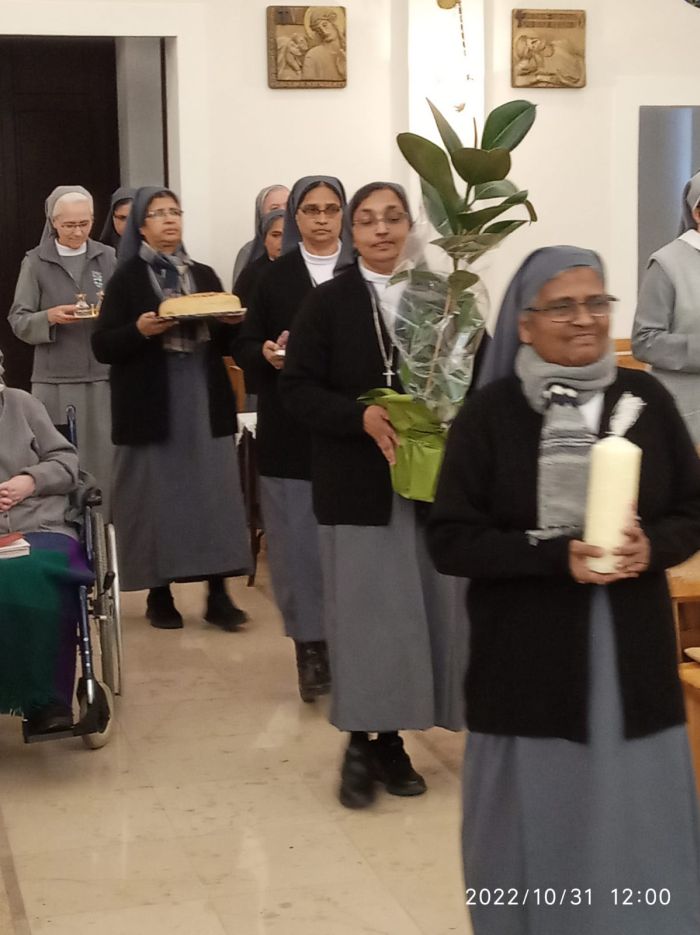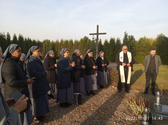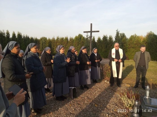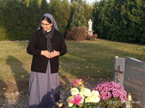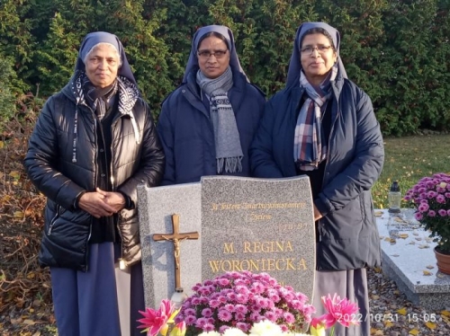 Upłynęło niewiele dni i 31 października br. Ks. Wojciech i Ks. Piotr przywieźli do Pokrzywna nie tylko sześć naszych bydgoskich Sióstr Satyaseva, ale także wyjątkowych gości z Indii: S. Ruth – obecną przełożoną generalną Służebnic Prawdy Bożej, S. Teyamę – wcześniejszą przełożoną generalną, a równocześnie tę, która rozpoczynała polską fundację Zgromadzenia Satyaseva oraz S. Agnes i S. Emilę – obecną i byłą ekonomkę generalną. Dla Sióstr z Indii pielgrzymowanie do grobu Założycielki Zgromadzenia, a naszej dawnej współsiostry, M. Reginy Woronieckiej, było niezwykle poruszającym wydarzeniem. Towarzysząc Siostrom na cmentarzu wspominałyśmy nasze spotkania ze św. Anielą przy Jej relikwiach w Brescii. I dla Sióstr Satyaseva i dla naszej wspólnoty w Pokrzywnie był to naprawdę świąteczny dzień. Jego centrum była wspólna Msza św. w naszej kaplicy będąca zwieńczeniem roku jubileuszowego związanego z 100. rocznicą urodzin M. Reginy Woronieckiej. Wspólna radość przedłużyła się podczas świątecznego obiadu, a potem także w czasie odwiedzin u naszych starszych Sióstr w Infirmerii, zwłaszcza u s. Teresy Bartnickiej.