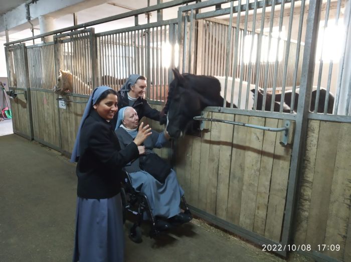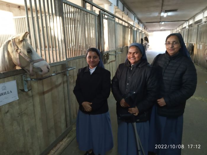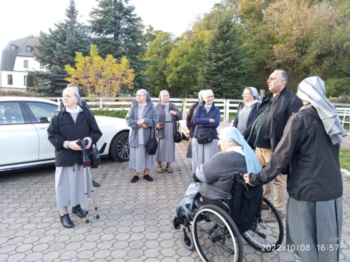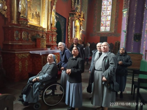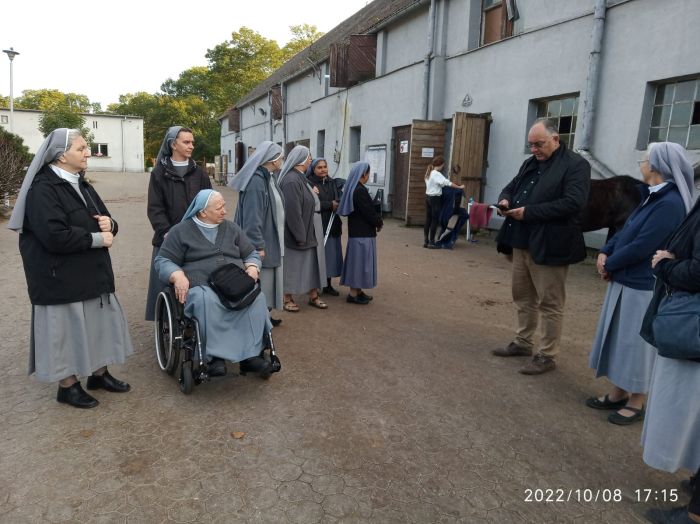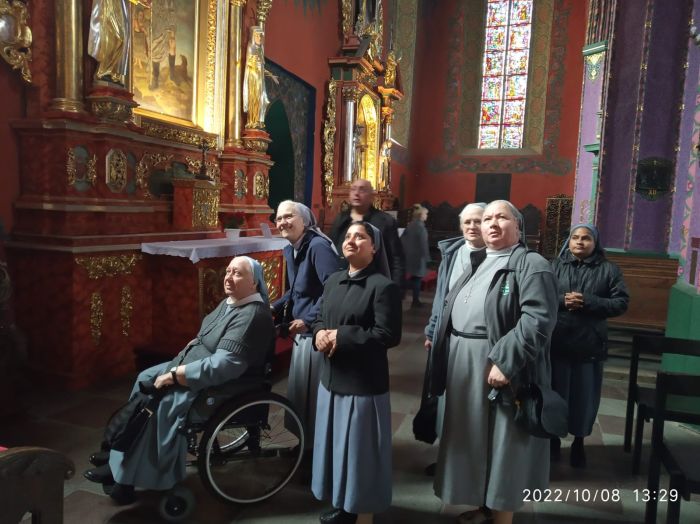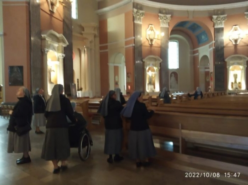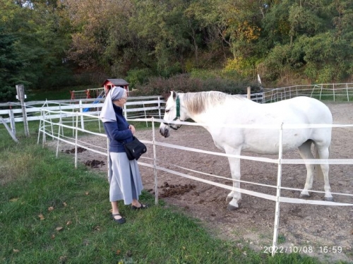 Potem, w sobotę 8 października br., 8 z nas, na czele z Przełożoną, S. Haliną Bobkowską, udało się z rewizytą do Bydgoszczy. Był to bardzo bogaty w doświadczenia dzień spotkań z naszymi Siostrami oraz zaprzyjaźnionymi z nimi Ks. Wojciechem Przybyłą i Ks. Piotrem Bukowskim. Gościłyśmy w Domu Księży Emerytów św. Jana Pawła II, gdzie posługują trzy Siostry Satyaseva, zwiedziłyśmy zabytkowe centrum Bydgoszczy oraz katedrę, a przy okazji dom biskupów bydgoskich, gdzie żyje i służy druga trzyosobowa wspólnota Sióstr Satyaseva w Polsce. Popołudnie zeszło nam w klimatach „anielskich”. Zaczęłyśmy wspaniałym obiadem w Pierogarni „Pod Aniołami” przy ul. Pomorskiej, a potem z Siostrami i Księżmi pojechaliśmy do Leśnego Parku Kultury i Wypoczynku (Myślęcinek), gdzie Caritas Bydgoska prowadzi Ośrodek Rekreacji Konnej również Pod Aniołami. Po drodze nawiedziłyśmy dwa wspaniałe bydgoskie kościoły: przypominającą architektonicznie rzymski Panteon Bazylikę pw. Św. Wincentego a Paulo przy klasztorze Księży Misjonarzy oraz miejsce ostatniej Mszy św. bł. Księdza Jerzego Popiełuszki, czyli kościół pw. Pierwszych Polskich Braci Męczenników, gdzie właśnie odbywało się ogólnopolskie spotkanie Wojowników Maryi. Wróciłyśmy wieczorem pełne wrażeń.