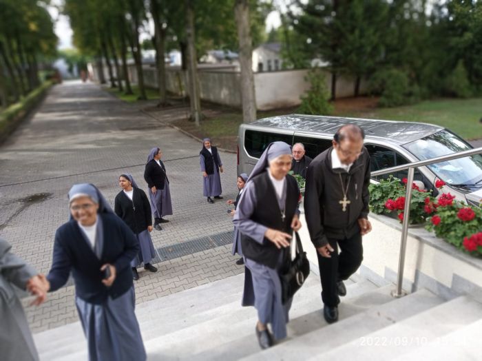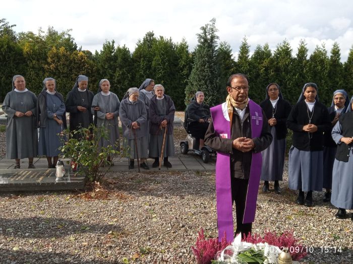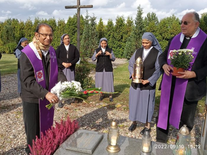 Najpierw, w sobotnie popołudnie 10 września br. gościłyśmy w Pokrzywnie obie bydgoskie wspólnoty, czyli sześć Sióstr Satyaseva z Ks. Wojciechem Przybyłą, dyrektorem Caritas Diecezji Bydgoskiej, przyjacielem i opiekunem duchowych córek Matki Reginy w Polsce. Powodem tych odwiedzin była niecodzienna wizyta wracającego do Indii po pobycie w Watykanie hinduskiego Biskupa Antonego Vazhappally. Biskup Antony, który osobiście znał Matkę Reginę Woroniecką, miał pragnienie nawiedzić Jej grób, który znajduje się na naszym pokrzywiańskim cmentarzu zakonnym.