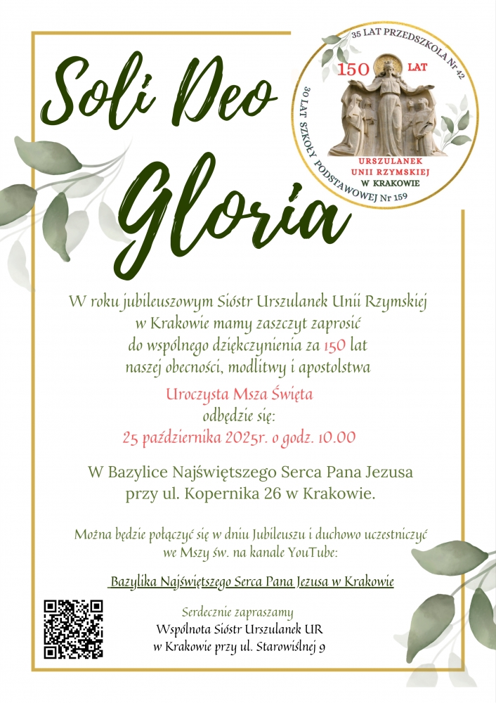 Wspólnota krakowska przeżywa w tym roku wyjątkowy jubileusz: 150 lat obecności i wypełniania urszulańskiej misji w tym mieście. Zapraszamy wszystkich chętnych do włączenia się w dziękczynienie składane Panu Bogu podczas Eucharystii sprawowanej w sobotę, 25 października 2025 r. o godz.10:00 w Bazylice Najświętszego Serca Pana Jezusa Ojców Jezuitów w Krakowie. Będzie to możliwe także poprzez kanał YouTube.