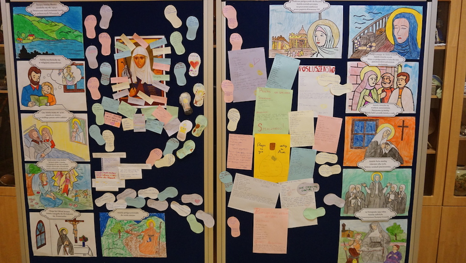 W kontekście zbliżającej się Uroczystości św. Anieli uczniowie zostali zaproszeni do pochylania się nad wybranymi fragmentami jej pism. Młodszych wychowawcy zaprosili do kolorowania malowanek przedstawiających sceny z życia św. Anieli. Starsi musieli wysilić się bardziej – uruchomiając kreatywność i wyobraźnię, zaprezentować co wynieśli ze swojej lektury w formie Przepisu na … według św. Anieli. Trzeba przyznać, że byli bardzo pomysłowi, czego zilustrowaniem jest chociażby przepis na posłuszeństwo rodzicom stworzony przez jedną z grup. Jakich składników należy użyć? Nieodzowny jest: szacunek, zaufanie, pokora, autorytet rodzicielski, miłość oraz szczypta cierpliwości i wyrozumiałości. Wszystko to trzeba umiejętnie wymieszać.