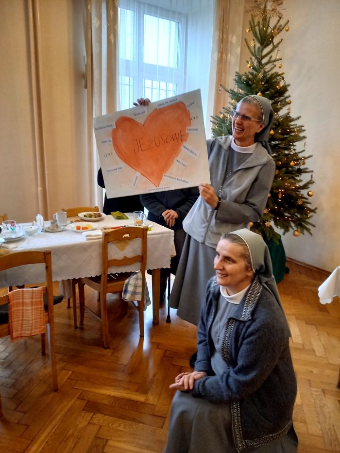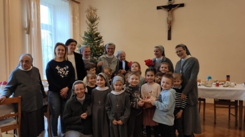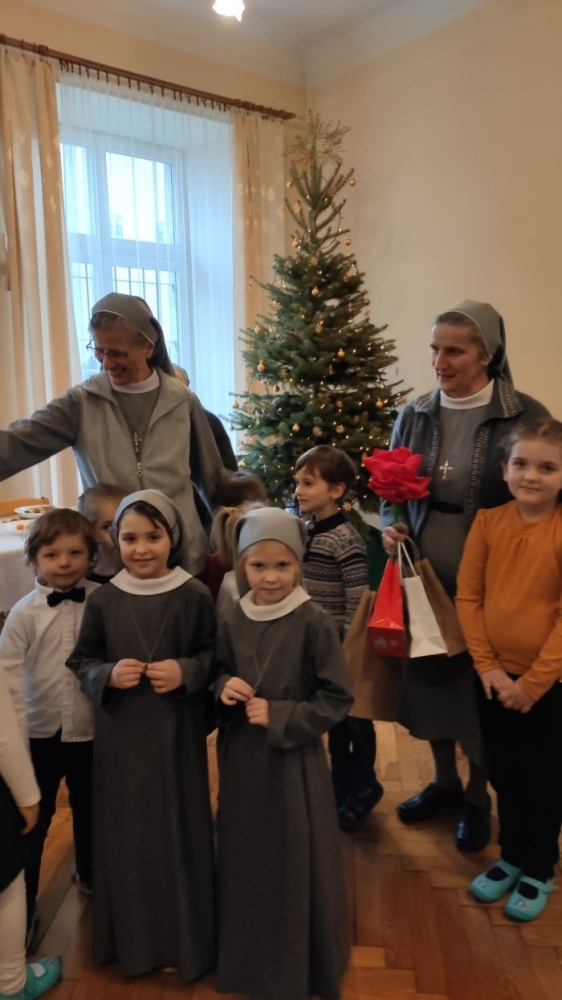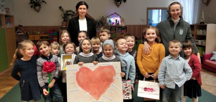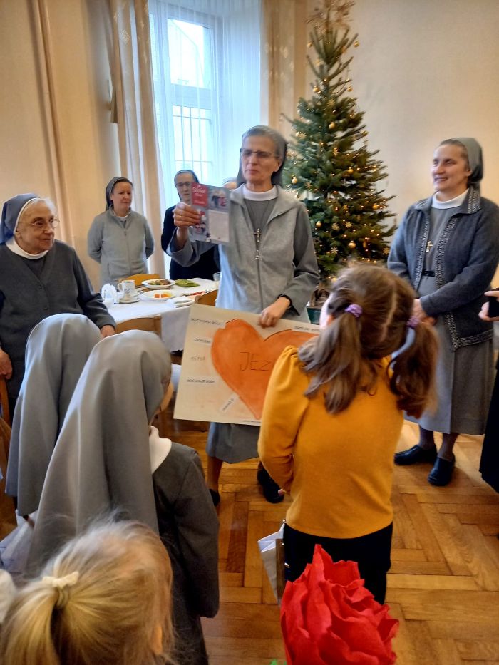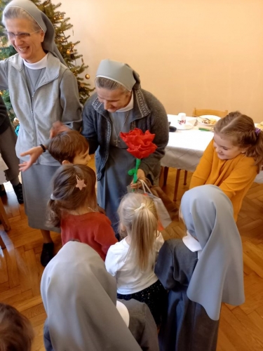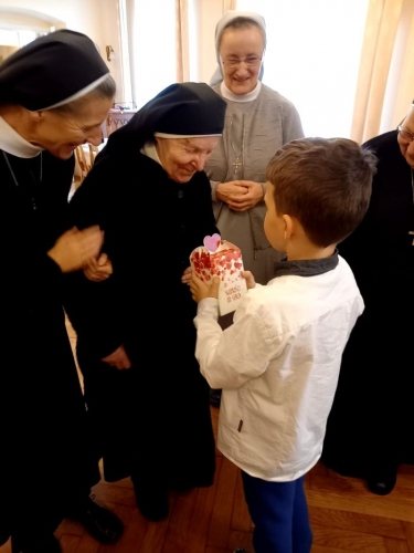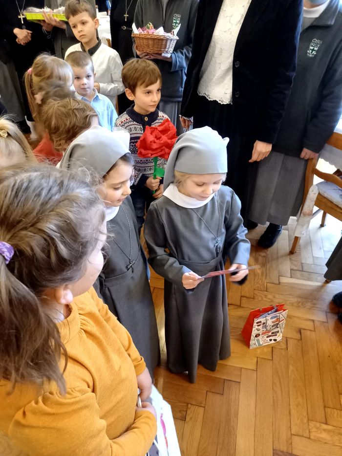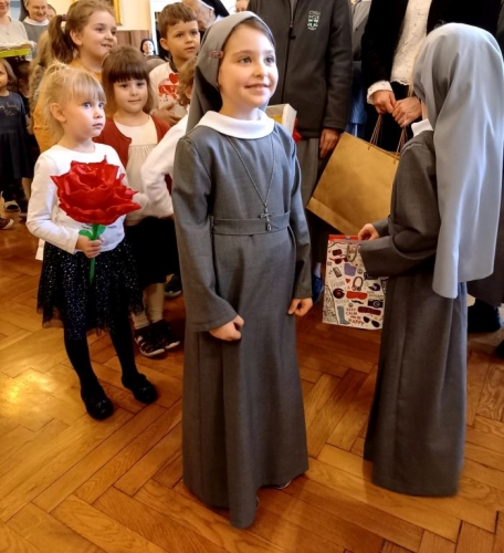 Przedszkolaki przygotowały dla Sióstr ze Zgromadzenia Krakowskiego niespodzianki: upiekły cynamonowe ciasta; wykonały serce Patronki z opisującymi je przymiotami; kolorowe, krepinowe kwiaty Świętej Anieli, portret Świętej w kapliczce z papieru oraz drobne upominki samodzielnie wykonane wg własnych inwencji. Jednak największą i chyba najbardziej zaskakującą niespodzianką tego dnia była wizyta najstarszych Dzieci (przedstawicieli całej społeczności krakowskiego Przedszkola) w Refektarzu. Przedszkolaki złożyły Siostrom okolicznościowe życzenia, zaśpiewały mericiańskie pieśni, tradycyjne „Sto lat” oraz wręczyły Siostrom na ręce Sióstr - Prowincjalnej i Przełożonej krakowskiej Wspólnoty słodkości i podarunki. Bardzo wdzięcznie wyglądały w stroju urszulańskim Nela i Emilka (kto wie, może przyszłe siostry Urszulanki?), które z właściwą roli powagą, ale i ogromną przyjemnością przyniosły wielkie serce św. Anieli. Kilka dziewczynek odczytało autorski wiersz Emilki napisany specjalnie na tę okazję. Dzieci także otrzymały od Sióstr coś dobrego do „połasuchowania” po powrocie do Przedszkola. Krótkie spotkanie z Siostrami było przepełnione pozytywnymi emocjami i mamy niemal pewność, że towarzyszyła mu także duchowo w Niebie sama Święta Patronka.