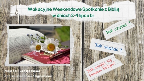 Na początek wakacji, w dniach 2 - 4 lipca 2021 br. zapraszamy do Częstochowy na rekolekcje biblijne, które będą miały charakter warsztatowy. Jest to propozycja skierowana do osób pragnących spotkać żywego Boga w Słowie, Który pisze razem z nami historię naszego zbawienia.