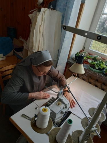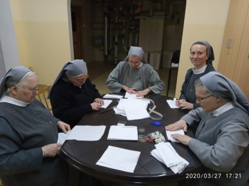 Jesteśmy otwarte na tych, którzy do nas dzwonią z prośbą o modlitwę lub chcą po prostu usłyszeć kogoś, porozmawiać, podzielić się swoimi obawami. Do naszych furt ciągle pukają osoby biedne, bezdomne, które teraz jeszcze bardziej potrzebują zwykłej uwagi i konkretnej pomocy. Zbliżają się Święta, więc przygotowujemy dla nich paczki. Przychodzą też osoby starsze, często tylko po to, by się upewnić, czy im pomożemy zrobić zakupy, wykupić receptę, gdy będzie taka potrzeba, bo – jak mówią – „na razie jeszcze sobie radzimy”…. I odchodzą uspokojeni z numerem naszego telefonu na kartce. Tam, gdzie jest to możliwe, a przede wszystkim, na ile pozwalają na to obowiązki, zwłaszcza szkolne, siostry podejmują się szycia maseczek ochronnych. Jedna ze wspólnot postanowiła też wnieść swój finansowy wkład w zakup respiratora.