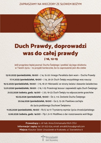 Jeśli pragniesz lepiej poznać Ducha Świętego i poddać się Jego działaniu w Twoim życiu – to przyjdź koniecznie, bo to zaproszenie jest dla Ciebie. Zapraszamy na wieczory ze Słowem Bożym, które będą odbywać się w Krakowie, w Klasztorze Sióstr Urszulanek przy ul. Starowiślnej 9.