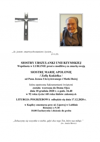 Siostry Urszulanki Unii Rzymskiej Wspólnota w Lublinie prosi o madlitwę za zamrłą s. Apolonię Kukiełka od Pana Jezusa Ukrzyżowanego i Matki Bożej /Zofię Kukiełka/.