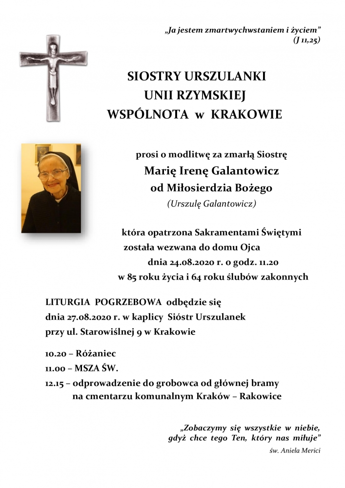 SIOSTRY URSZULANKI UNII RZYMSKIEJ WSPÓLNOTA w KRAKOWIE prosi o modlitwę za zmarłą SiostręMarię Irenę Galantowicz od Miłosierdzia Bożego (Urszulę Galantowicz).