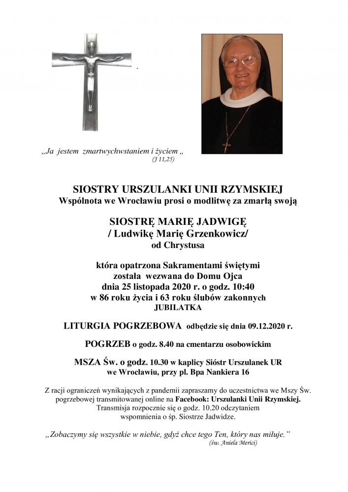 Z racji ograniczeń wynikających z pandemii zapraszamy do uczestnictwa we Mszy Św. pogrzebowej transmitowanej online na Facebook: Urszulanki Unii Rzymskiej. Transmisja rozpocznie się o godz. 10.20 odczytaniem wspomnienia o śp. Siostrze Jadwidze.